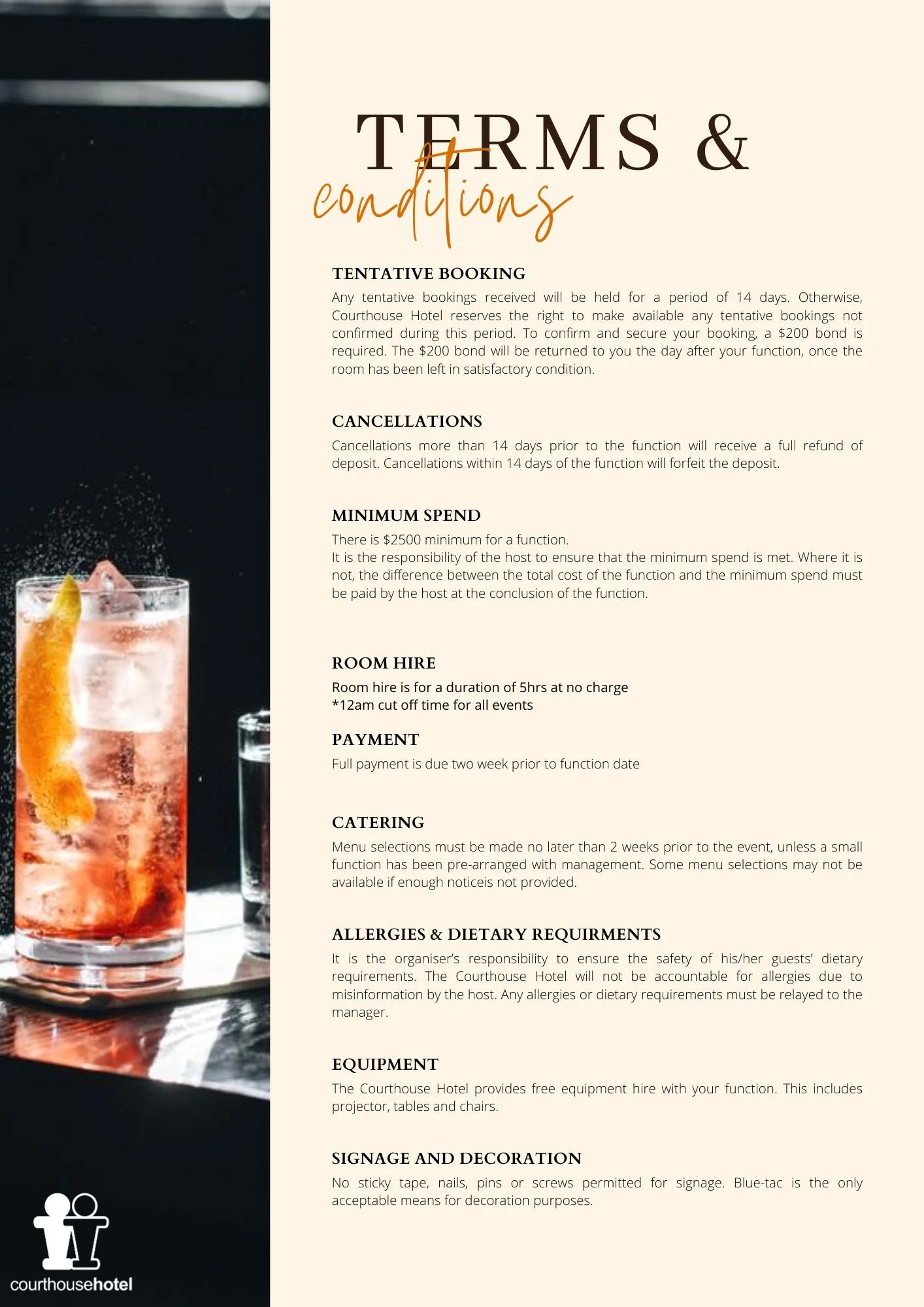 The Courthouse can cater your event in style and with attention to detail. Be it a birthday, anniversary, christening, engagement; wake, work gathering, or meeting; we have a versatile private space available to suit every occasion, with indoor and outdoor options on the newly renovated rooftop.